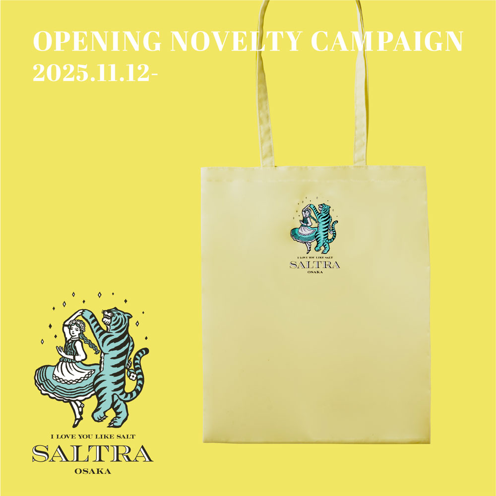 ソルトラのグランドオープンを記念して、期間中、税込5,500円以上お買い上げのお客様に、オリジナルトートバッグをプレゼント!ブランドカラーのイエローは、ぱっと気持ちを明るくします。お気に入りのお菓子を入れて街を歩けば、貴方の心もきっと軽やかに。