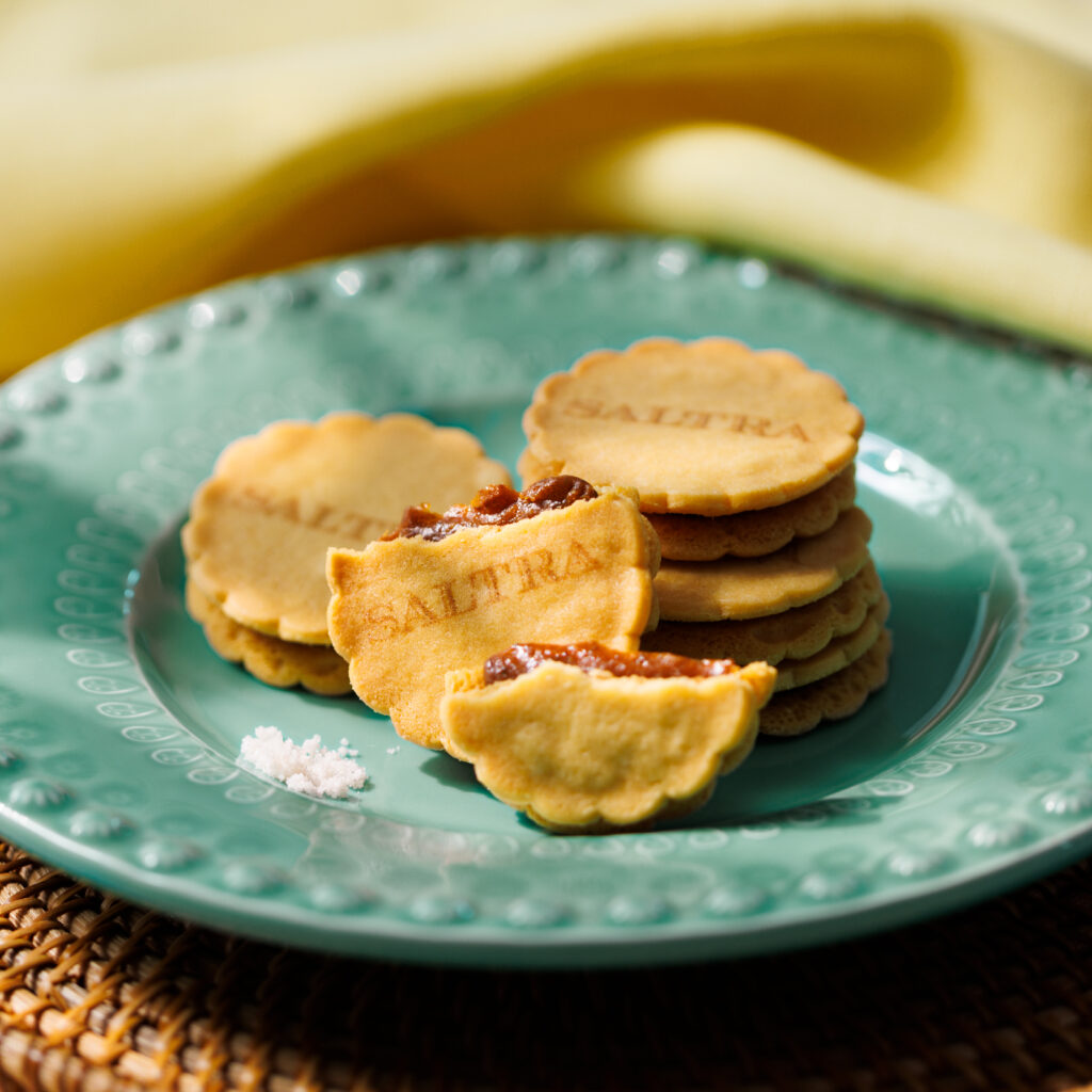 淡路島の藻塩を加えて炊き上げた自家製の塩キャラメルを、グラスフェッドバターを練り込み焼き上げた塩バタークッキーでサンドしました。キャラメルの濃厚な甘みと、まろやかな塩味が織りなす奥深いハーモニー。塩の魅力を知り尽くしたSALTRAの看板商品です。