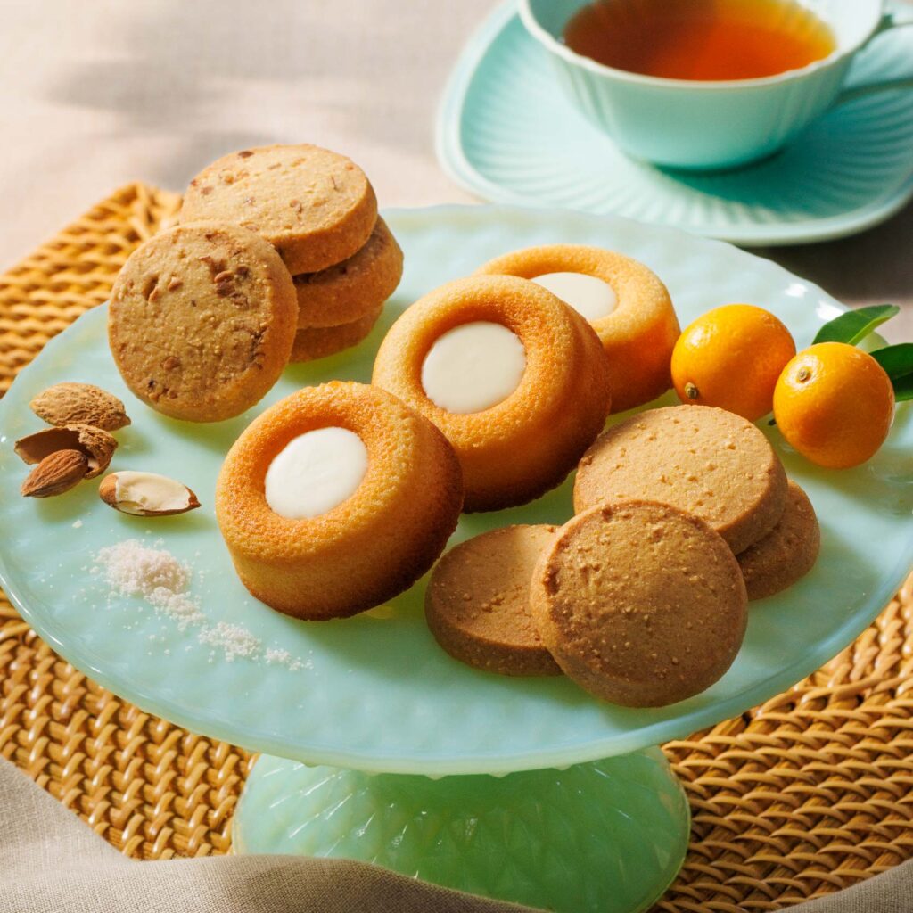 北海道でつくられたゴーダチーズに宮崎県産金柑のペースト、淡路島の藻塩を練り込み焼き上げたサクサクのサブレ。