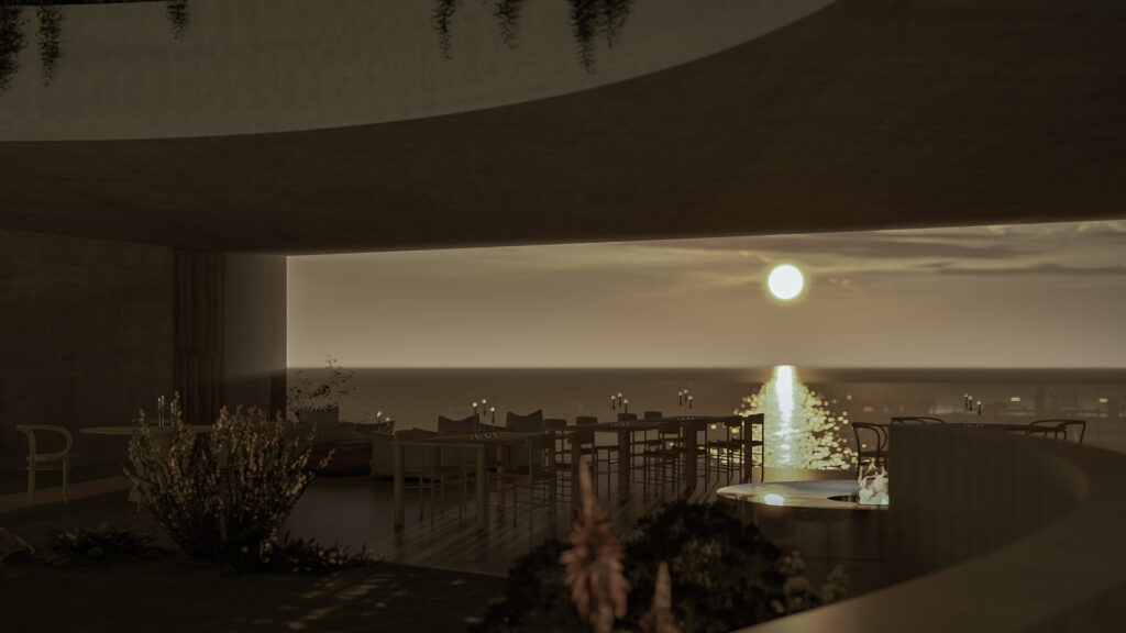 本プロジェクト「UMITO 淡路島 オーシャンルーフ」では、この島の特性を捉え、海沿いの敷地から見える瀬戸内海の広がり、潮風に揺れる植栽、四季折々の光の変化を建築のデザインに取り込み、訪れる人が淡路島の自然を五感で体感できるよう計画されています。島の風景の延長線上に在るように、建物が淡路島そのものの魅力を引き立てる“風景の一部”になるように設計され、さらに、淡路島の緩やかな丘陵や波打つ海岸線を意識したアプローチや視線誘導を設計に取り入れており、建物の内部空間だけでなく、外部空間を含めた体験全体を通して非日常感を演出しています。訪れる方々が、橋を渡る瞬間から海沿いの道を抜け、島特有の光と風を感じながら「UMITO 淡路島 オーシャンルーフ」に到着する。この旅路もまた、建築体験の一部となっています。