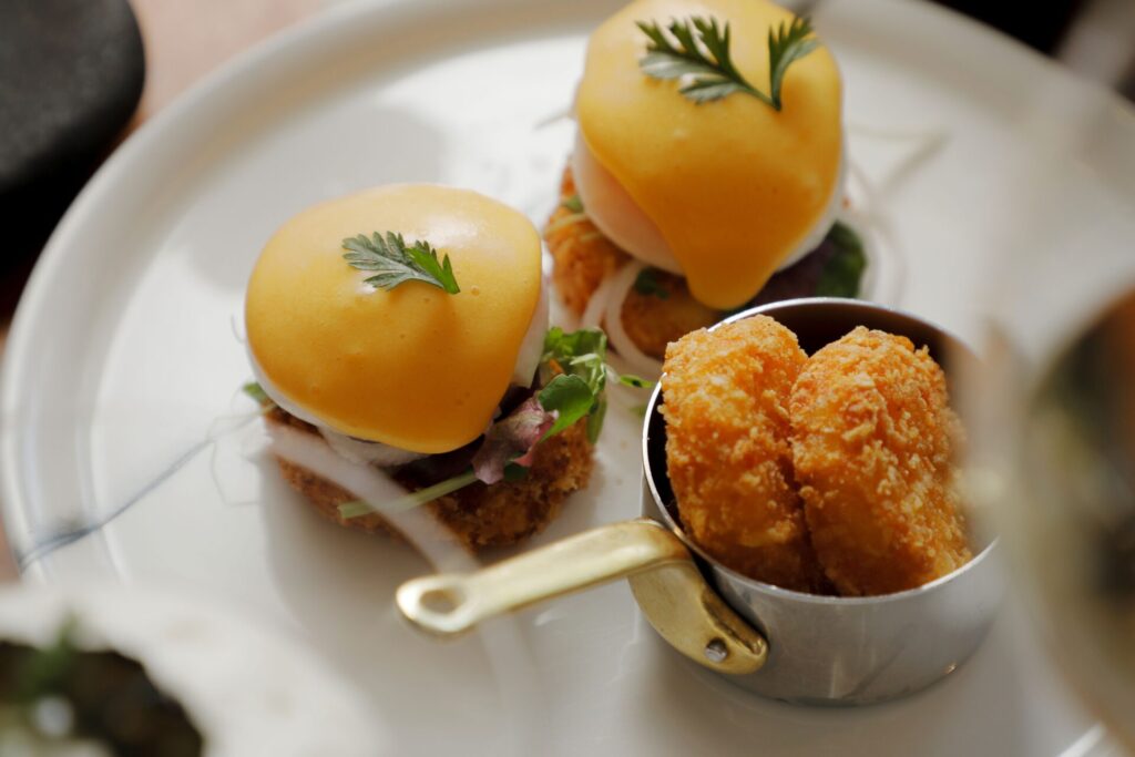 外はかりっと、中はクリーミーなクラブケーキに、大根のピクルスサラダ、ポーチドエッグ、平飼い卵の旨みが凝縮されたサフランオランデーソースを重ねたクラブケーキ。とろりと溶ける濃厚な卵に、柔らかくジューシーな蟹が絶妙にマッチするブランチの目玉メニューです。