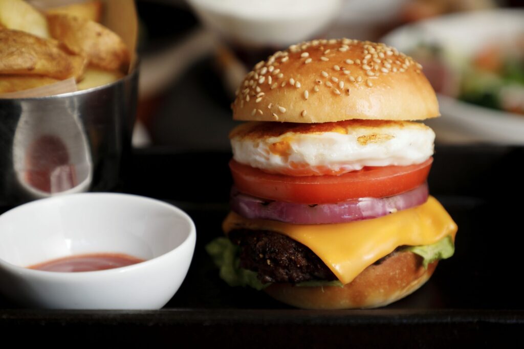 自家製のバンズで、和牛のパティ、レタス、トマト、オニオン、チェダーチーズをサンドした「ザ・ウィークエンドスマッシュバーガー」は、人気メニューのひとつ。スパイスの効いた自家製のシーズニングをアクセントに、食べやすいサイズのバーガーに仕上げました。