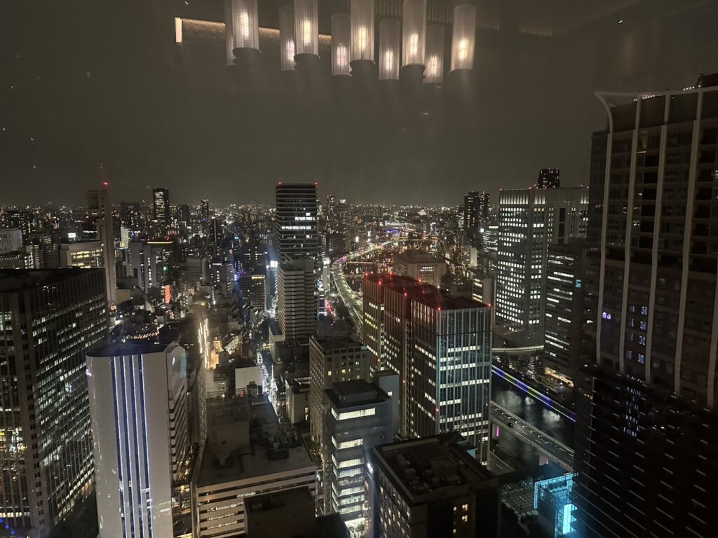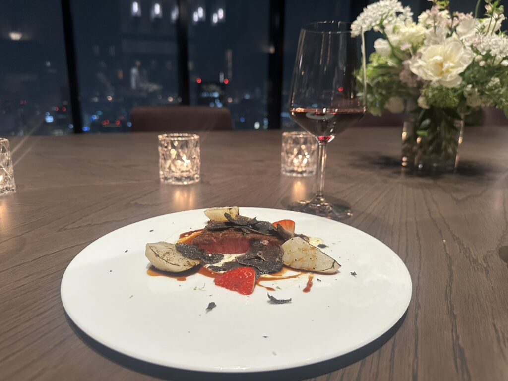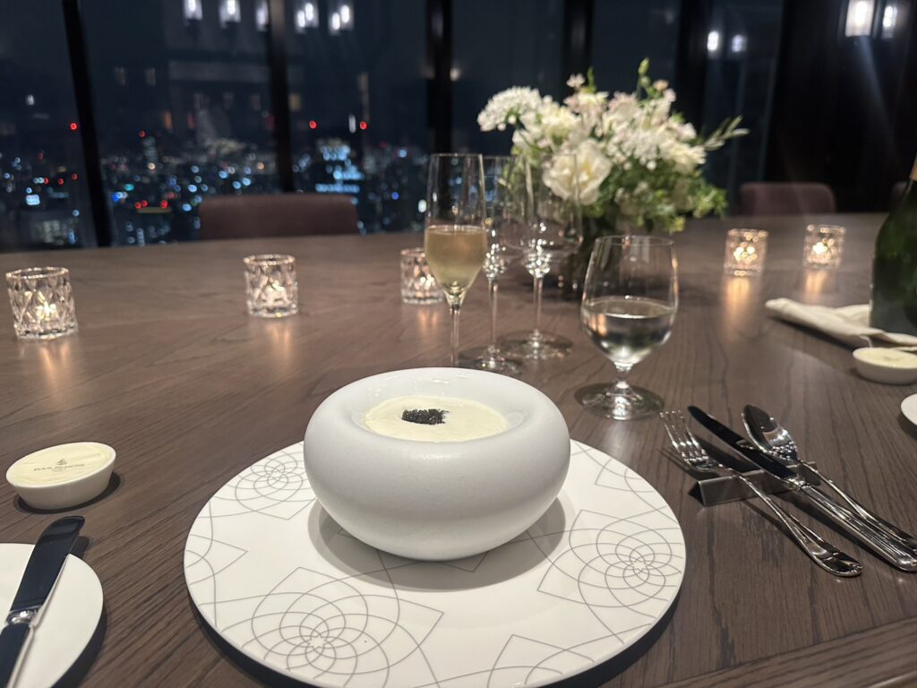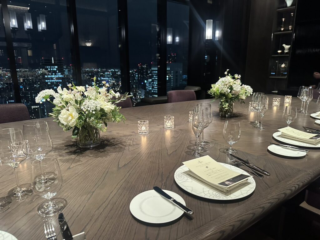 まず視界に飛び込んできたのは、洗練されたラグジュアリーな空間と、その向こうに広がる大阪の夜景。あいにくの雨でしたが、窓一面に映る街の灯りがいっそう艶やかに輝き、幻想的な景色をつくり出していました。これほどプライベート感のある空間で、煌めく絶景を眺めながらディナーを楽しめる体験は、まさに特別なひとときと呼べます。