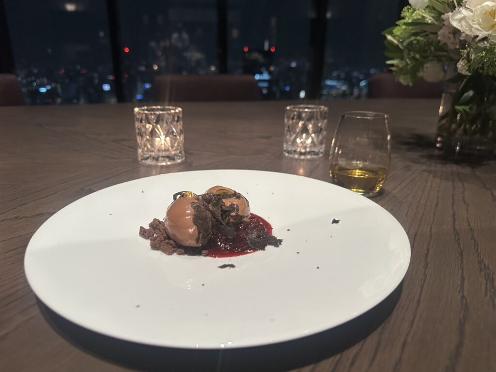オリーブオイルのムースに、濃厚なダークチョコレートのソルベ、そしてトリュフを合わせた印象的なデザート。ノーミルクで仕上げたチョコレートソルベは、甘さの中にカカオの深みをしっかりと感じ、トリュフの芳醇な香りとも好相性。デザートワインの甘みとグリオットチェリーのきりっとした酸味がバランスよく、食べながら美しい余韻に浸りながら、コースを終えることができました。