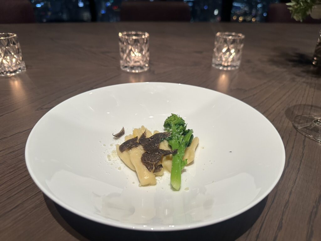 【パスタ】手作りカヴァテッリ、ブロッコリーニ、スモークバター、ペコリーノチーズ、トリュフ、柚子ゼスト