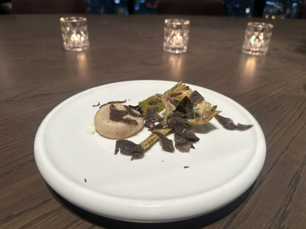 ・[前菜] 北海道産帆立のポシェ:アーティチョーク、ピスタチオ、オレンジ、トリュフ