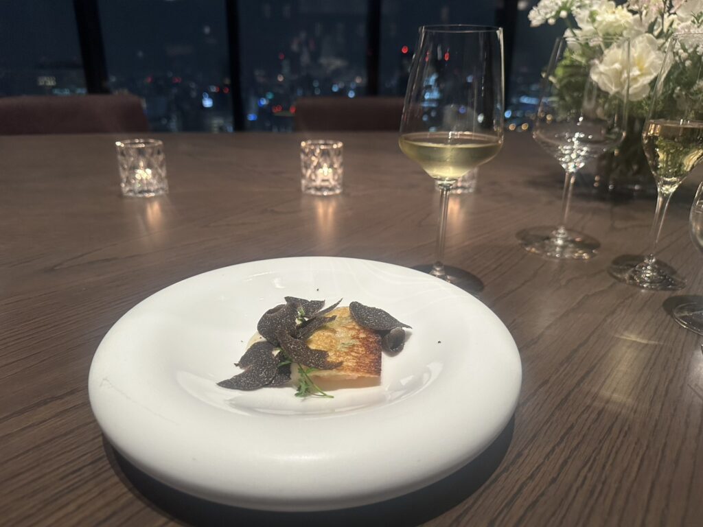 北海道産牡丹海老とセロリアックの甘みと柔らかさを、山椒の葉の爽やかな香りと軽やかな辛味、トリュフをアクセントにして引きたてられた一皿。ベーカリーで丁寧に焼き上げた自家製ブレッドは、外はサクッと香ばしく、見た目にも洗練された佇まい。隠し味には、海老の味付けに忍ばせた柚子胡椒。すっきりとした口当たりのやわらかなワインと合わせることで、絶妙なペアリングがとても印象的でした。
