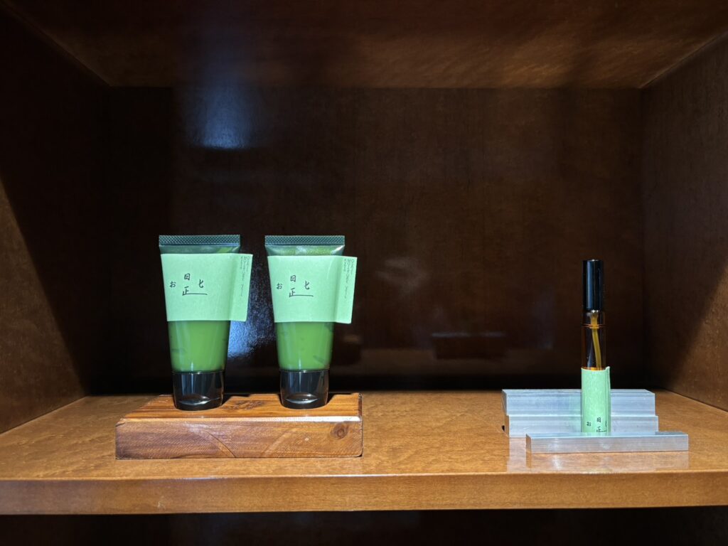 京都限定アイテムとして2種類を展開しています。左のハンドクリームは檜を基調とした落ち着きのある香り、右のオードトワレはお茶をベースに、爽やかな香りが特徴です。いずれも本店舗でのみ購入可能なアイテムです。京都を訪れた際の手土産としても注目の商品です。