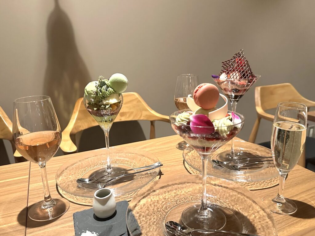 今回は、今が旬の苺を使った、見た目にも美しい「告白」をチョイス。ペアリングのドリンクには、ビール、ハイボール、カクテル、ワインなど幅広い種類が取りそろえられています。パフェは、甘味と酸味のバランスがよく、様々な素材が器の中に幾層にも重なり、食べ進めていく度に食感が変わります。中に入ったレモンとコーヒーのジュレがいいアクセントになり、甘すぎず、スパークリングワインとの相性も抜群でした!食後にも食べやすいサイズ感ながらも、食べ応えたっぷりの一品。
