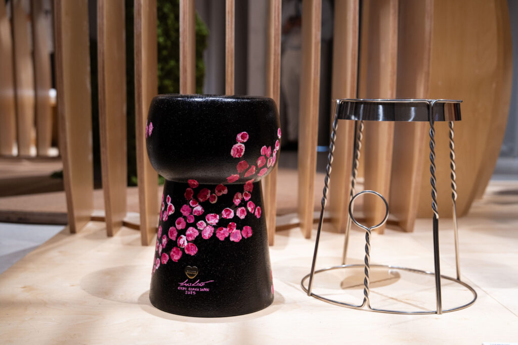 一つ目は、巨大なシャンパンコルクをモチーフにした 「CHAMPAGNE SIDE TABLE(シャンパンサイドテーブル)」。Luís Leãoが作成した、頑丈なコルク本体に優雅な金属構造を組み合わせたデザインは、祝祭の華やかさと自然素材の温かみを兼ね備えています。 ポルトガルは世界一のコルク生産国であり、この作品にも廃材のコルクが使用されていました。さらに、万博のために特別に、日本を象徴する「桜」がペイントされており、両国の文化が美しく融合しています。 見た目も素材もコルクという遊び心あるデザインに、思わず目を奪われました。コルクを再利用して家具にするという発想は新鮮で、とても印象的でした。