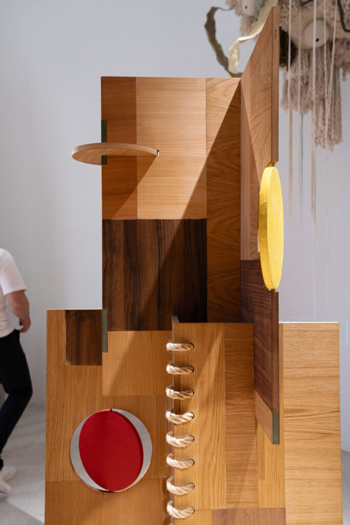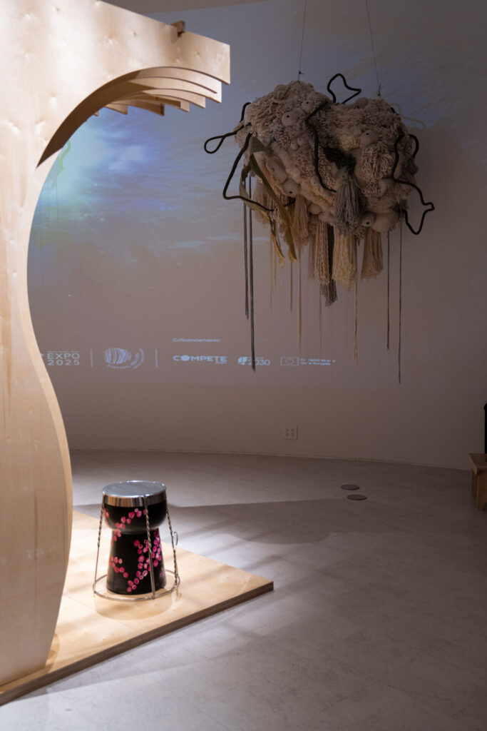 この作品はビスを使わずに部品を組み合わせて構成されており、縄もリサイクル素材が使用されていました。展示を回すと、波同士が合わさる瞬間を思わせ、日本とポルトガルが海を通じて結ばれてきた歴史を視覚的に表現していました。忘れられた素材に新しい命を吹き込み、文化の出会いを象徴するような作品でした。