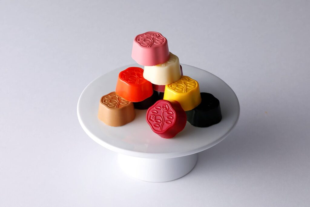 花椿マークをかたどったカラフルなボンボンショコラは、その一粒一粒がどれも個性的です。カフェ、フレーズ、フランボワーズ、マンゴー、スパークリングワインの見た目も鮮やかな5種の味わいが魅力。