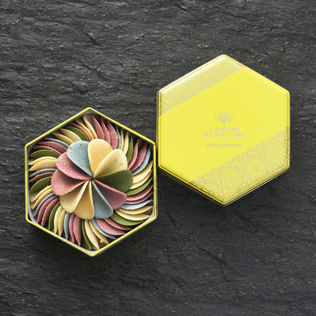 蜂蜜と花粉を使った6色の花びらのチョコレート。身体に優しい素材にこだわり着色料を使用しない素材本来の優しい色合いです。