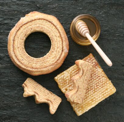 上質な有機米粉と有機玄米粉を使用した、グルテンフリーの蜂蜜バウムクーヘンです。