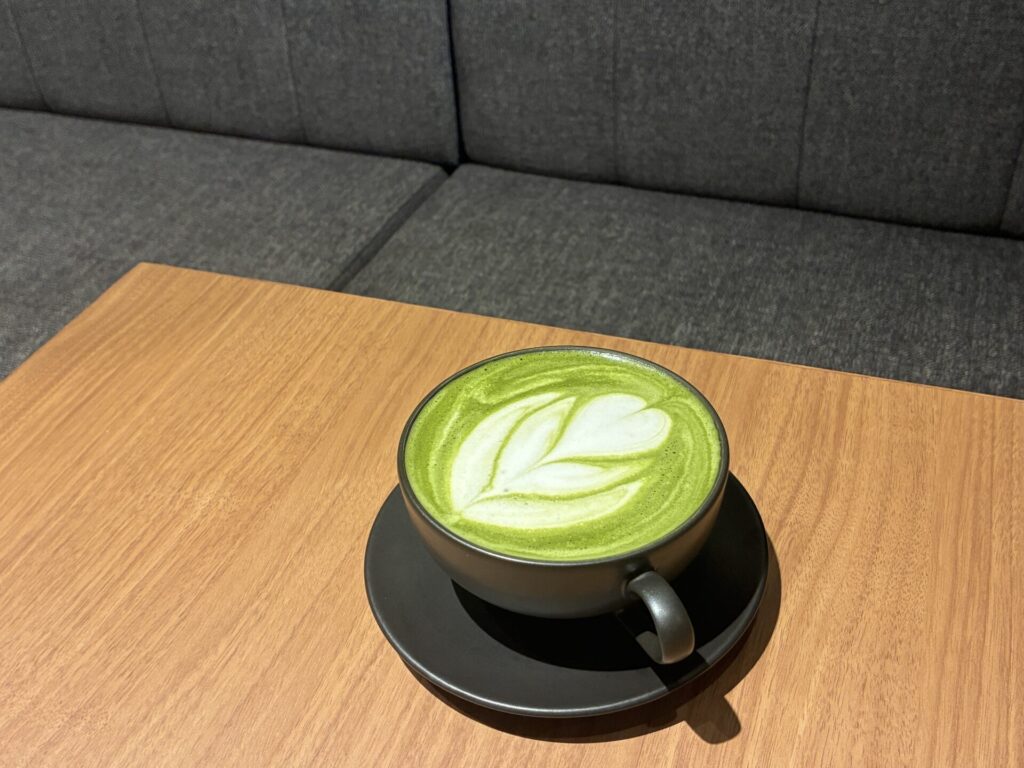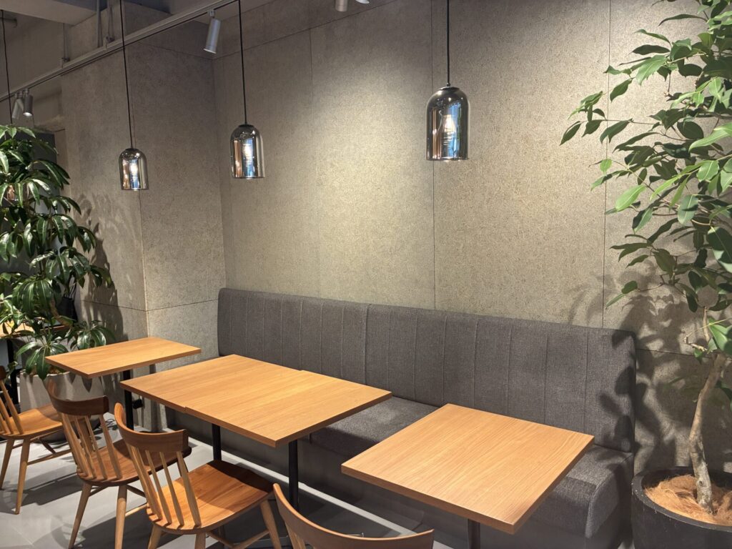 店内の基調カラーには、グレーを採用。これは、伊右衛門ならではのお茶の“緑”を最も美しく引き立てるための設計で、茶葉や抹茶、ドリンクの色彩が際立ち、視覚的にもお茶の存在感を強く印象づけます。内装素材には、柔らかく、温かみのある質感のものを厳選。無機質になりがちなモダン空間に、心地よいぬくもりを添えることで、長居したくなる、居心地の良い空間を演出しているのだそう。壁面には、木の繊維を原料とした「木毛板(もくもうばん)」を使用しており、空間全体にやさしい印象をもたらしています。