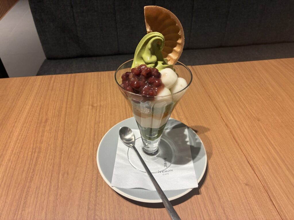 全国の伊右衛門カフェでも一番人気だという風味豊かな宇治抹茶を使用した伊右衛門カフェのソフトクリームパフェ。もちもとした白玉と濃厚な抹茶ソフト、甘すぎず全体の調和を保ってくれるあずき、そして、あんずソースの甘い味わいがアクセントになっています。モナカやフレーク、抹茶ゼリーの食感も楽しめるティータイムのお供として是非一度食べていただきたい一品です。